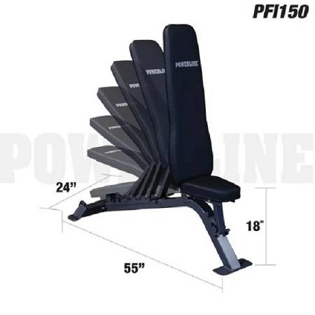 Powerline by Body-Solid’s PFI150 Flat/Incline/Decline Bench is designed for use in home, garage and basement gyms with an emphasis on workout variety thanks to independent ladder-style back (-18°, 0°, 15°, 30°, 45°, 60°, 80°) and seat pad (0°, 10°, 18°) adjustments. The PFI150 is an ideal tool for numerous bench-based dumbbell and barbell exercises including bench press, dumbbell row, shoulder press, incline press, skullcrushers, biceps curls and many more.