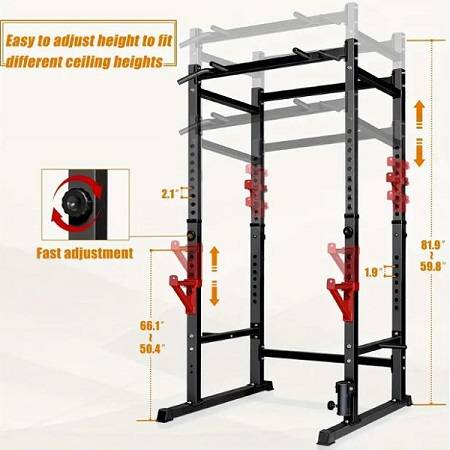 【Multi-adjustable design】 The front and rear barbell shelf of the deep squat cage can be adjusted to suit your height, as can the spindle link.